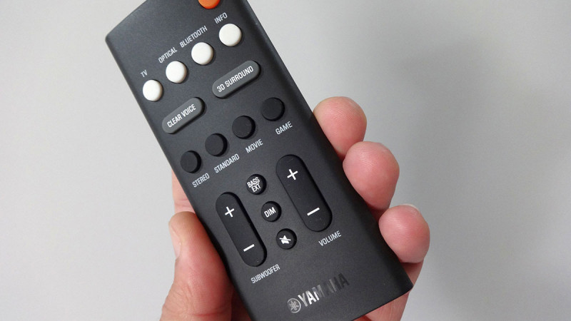 Acompanha a soundbar um controle remoto compacto e muito útil nos ajustes de graves (volume e extensão), modos de som (Stereo, Standard, Movie ou Game) e escolha de entrada (Bluetooth, HDMI ou óptica). Essas mesmas funções estão disponíveis no aplicativo Yamaha Sound Bar Remote, que opera via Bluetooth.