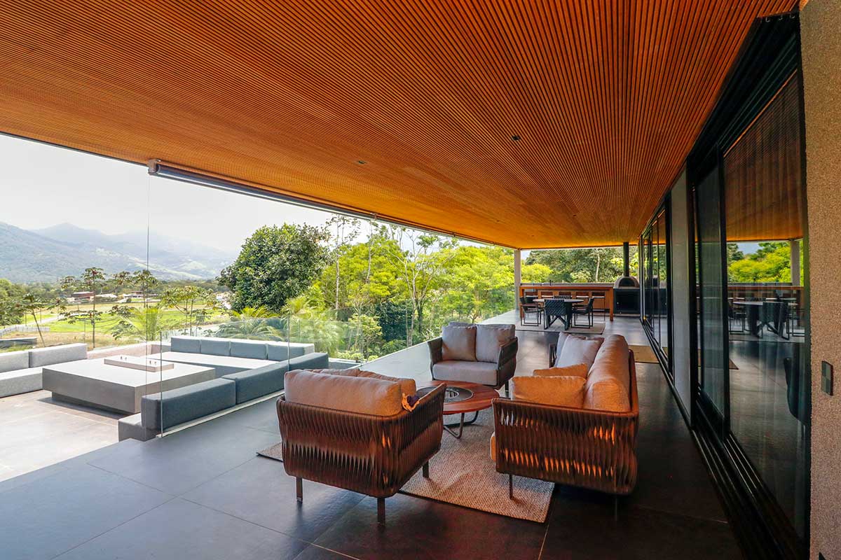 Na varanda do piso superior, toldos elétricos acionados pela automação protegem a família de sol, vento e chuva.