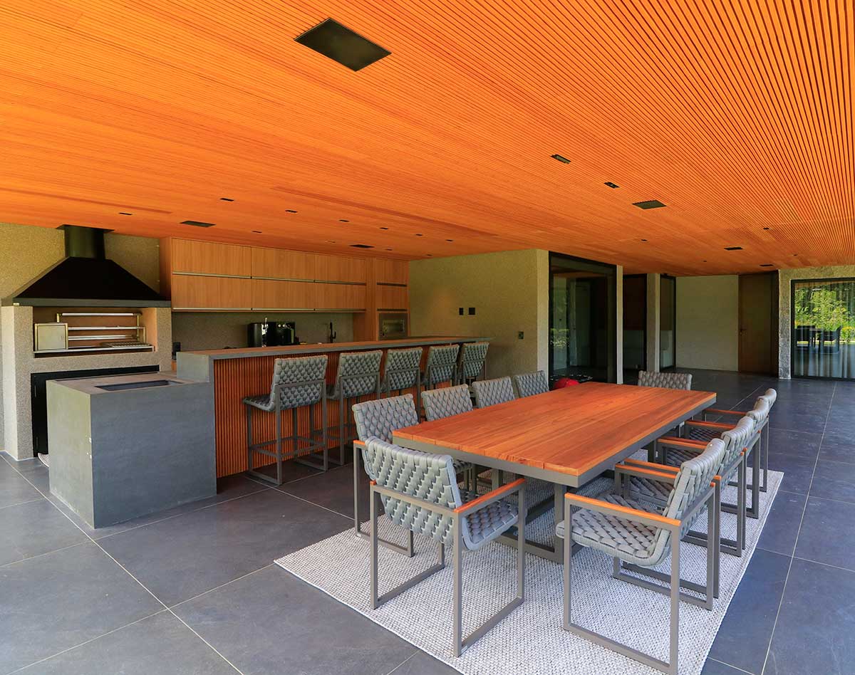 Vista do espaço gourmet, no mesmo estilo de decoração, com 6 caixas acústicas embutidasno teto de madeira.