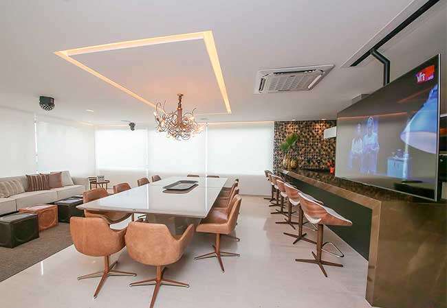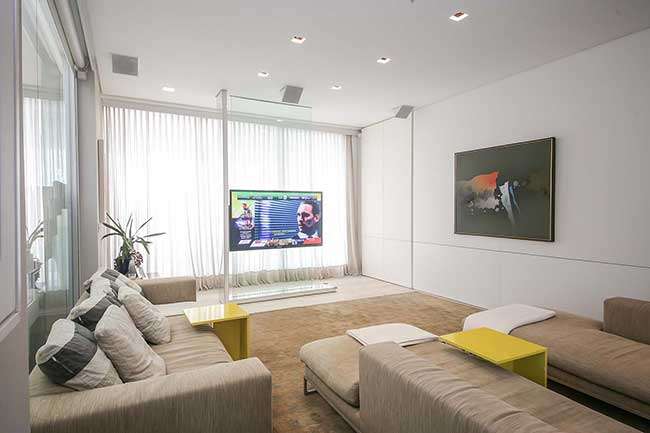 Difícil pensar numa solução mais prática quando se tem apenas uma TV para atender mais de um ambiente. O trilho à direita na foto foi montado na laje para sustentar uma TV de 85”, que pesa cerca de 70kg. Comando pelo controle remoto, ele se movimenta para a direita ou a esquerda, conforme a necessidade de cada momento. Ideal, por exemplo, para espaços gourmet ou salões como esse.