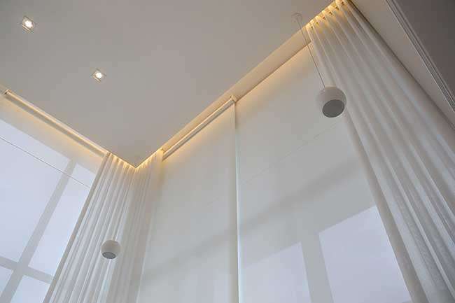 Nesta cobertura em Balneário Camboriú (SC), uma das suítes não tinha espaço para uma TV. A saída criativa foi utilizar um flap, acessório embutido no forro e que pode abrigar TVs de até 75”. Note que a sanca de gesso tem largura suficiente para acomodar a estrutura metálica do flap e os cabos de conexão. A um toque do controle remoto, a peça se abre para exibir a tela.