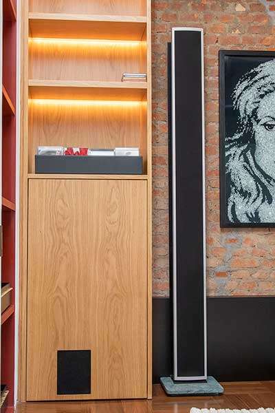 Você não vai encontrar esse tipo de caixa acústica em qualquer ambiente. Trata-se de um modelo americano, da marca Wisdom Audio, do tipo planar. Com mais de 2m de altura, dispersa os sons de maneira homogênea pelo ambiente. Mas precisa ser instalada no lugar certo, como aqui, discretamente.