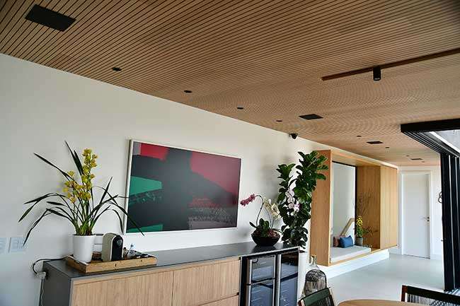 Aqui, o problema é instalar a TV de 65”, com tela muito fina, num local onde não havia parede nem caberia um móvel. A solução foi encomendar um painel de acrílico transparente, com um suporte específico para essa TV. Para compor o layout, as 3 caixas acústicas (direita, esquerda e central) foram instaladas no teto, alinhadas com o painel acrílico. E essas caixas são reclináveis, ou seja, os sons podem ser direcionados para quem está no sofá.