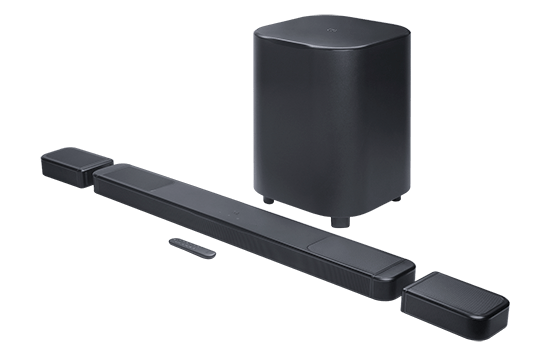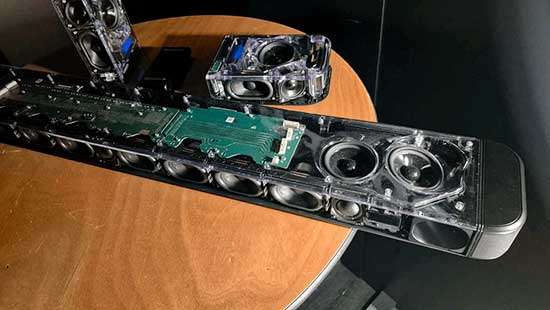 Especificada em 11.1.4 canais para áudio imersivo Dolby Atmos ou DTS:X, a nova soundbar utiliza falantes do tipo racetrack (foto), de perfil mais fino (2”x2,5”) e com alto alcance de médias frequências. Para os graves, a caixa vem acompanhada de um subwoofer sem fio de 10”, cuja potência indicada é de 150W RMS.