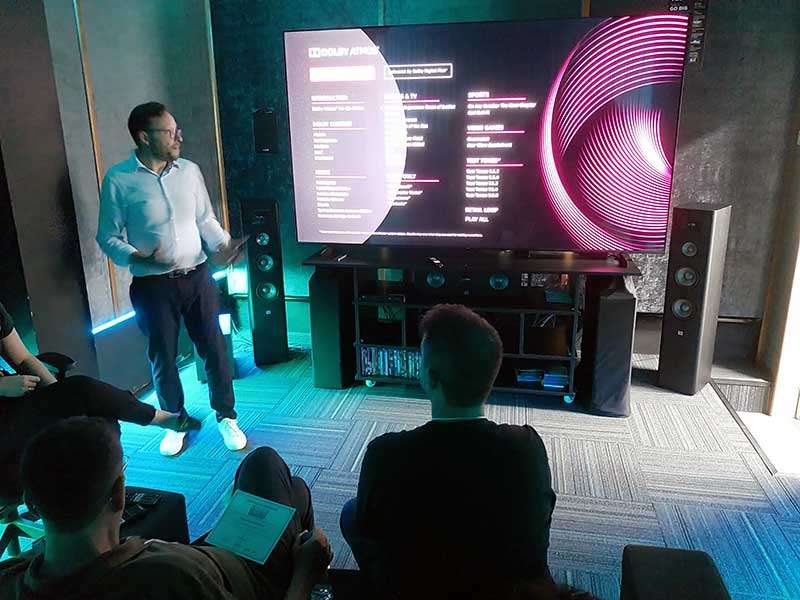 Foi um dia inteiro de imersão nos sistemas desenvolvidos pela Dolby. Além de uma apresentação técnica sobre o padrão Dolby Atmos e as formas corretas de instalação e ajuste, os participantes fizeram um tour guiado pelas salas que a empresa mantém como laboratório de pesquisas e testes.