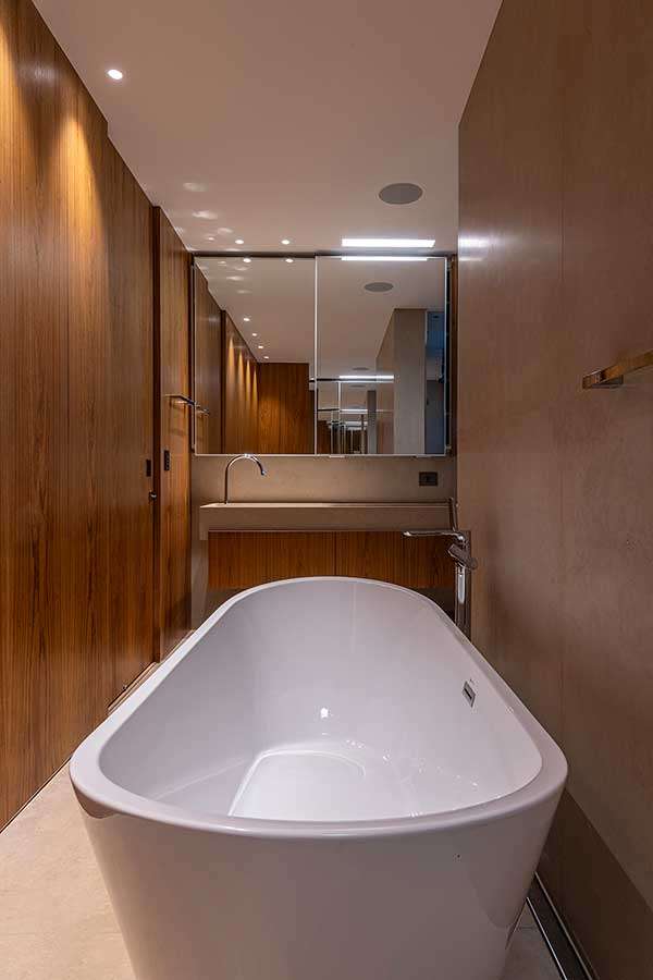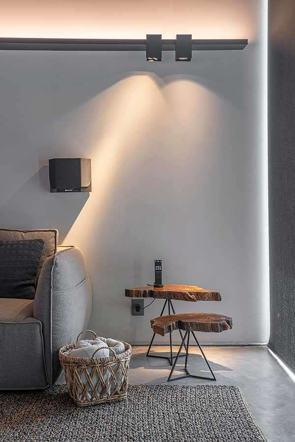 Uma dessas ideias originais foi fazer cortes na própria para embutir as caixas de som ambiente. “Enviamos uma caixa a uma empresa especializada, que a partir desse molde produziu uma réplica da caixa em impressão 3D”, conta Rocha. Com isso, os cortes na laje foram milimetricamente desenhados, na profundidade necessária para ocultar as caixas, explica ele.