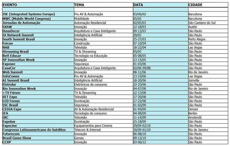 Segmentos como áudio/vídeo, automação, telecom, educação, segurança e inteligência artificial têm várias feiras, congressos e seminários na agenda do ano. A seguir, listamos os mais importantes, com data, local e links para informações complementares.
