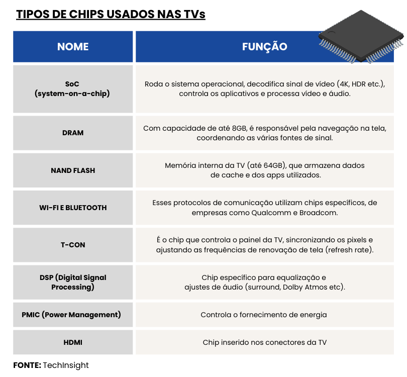Uma TV de alto padrão com IA, hoje, utiliza uma variedade de chips (veja o quadro), e são poucos os fornecedores de ponta. Na cadeia que atende o segmento, destacam-se marcas como Mediatek, Broadcom, Qualcomm, AMD, Texas e Samsung.