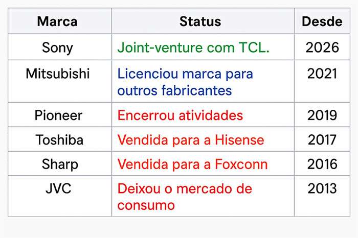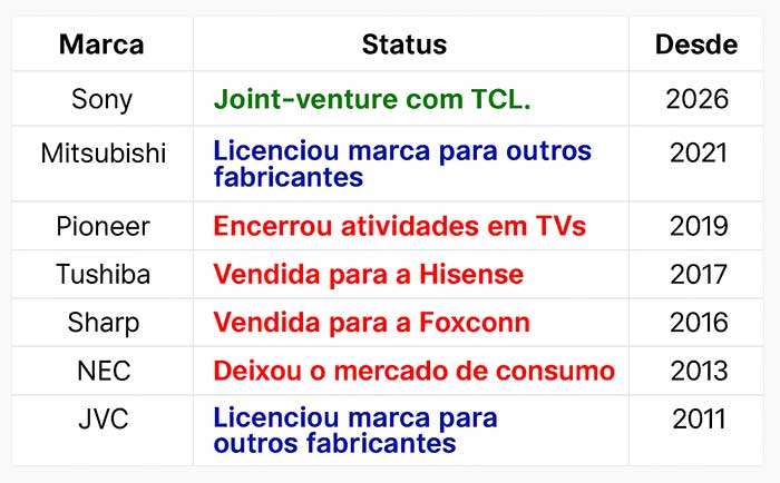 Nos últimos 15 anos, a Panasonic é a 8ª fabricante japonesa que decide sair do mercado de TVs (detalhes aqui). As que se mantêm no segmento foram absorvidas, em parte ou totalmente, por grupos chineses. Veja o quadro abaixo: